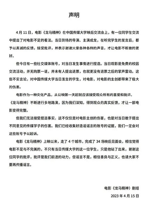 昨天(4月15日) “成龙被观众当场要求退票”的话题 冲上热搜第一 网传消息称,由成龙、刘浩存主演的电影《龙马精神》在中国传媒大学路演时,有观众当场问成龙怎么拍出这么烂的电影,并要求退票,此话一出全场响起雷鸣般的掌声。 翻看该消息的评论区,看到有多位当时在场或了解到情况的网友表示该信息不属实,并进行澄清。 据4月15日华声在线娱乐报道,有同学对电影提出了批评,并称“我们这个学校一个是有传输的功能,