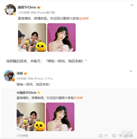 9月18日,资深经纪人陈震宇发文官宣徐娇回归周星驰公司,称:“星海漫航,辉耀前程。欢迎回归星辉大家庭”,并晒出照片,周星驰与徐娇同框,满满的回忆杀。 据悉,徐娇于2006年,主演个人首部电影作品《长江7号》正式进入演艺圈,且《长江7号》是由周星驰执导,周星驰、徐娇、张雨绮、林子聪主演的科幻喜剧电影。 来源:凤凰娱乐