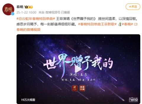 1月22日,春晚官方微博官宣“蛇年春晚特别单曲”——由王菲演唱的《世界赠予我的》。春晚官博称:“王菲演唱《世界赠予我的》 揽世间温柔,以深情回敬。感恩岁月赐予,每一刻都值得细细珍藏。”据悉,这是王菲时隔七年再度回归总台春晚的舞台。 据悉,这首歌由袁晶作词,曹正杰谱曲,两人都是来自湖北的音乐人,曾多次合作创作歌曲。而这首歌的监制则是王菲的老朋友常石磊。王菲,1969年8月8日出生于北京市东城区,华语