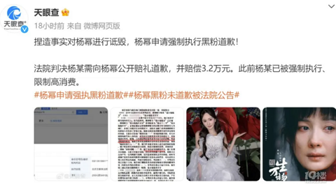 2月20日,杨幂与杨某网络侵权责任纠纷案件中,因杨某未履行致歉义务,杨幂申请强制执行,法院并公告民事判决书。内容显示,相关案涉内容中涉及侮辱的内容,充斥对杨幂的谩骂和人身攻击,构成对杨幂的侮辱。此外,相关内容涉及诽谤,属于捏造事实对杨幂进行诋毁,足以造成杨幂社会评价降低。 法院判决被告连续三十日置顶刊登致歉声明,向原告杨幂公开赔礼道歉,并赔偿杨幂精神损害抚慰金2万元、财产损失1.2万元。此前,涉事