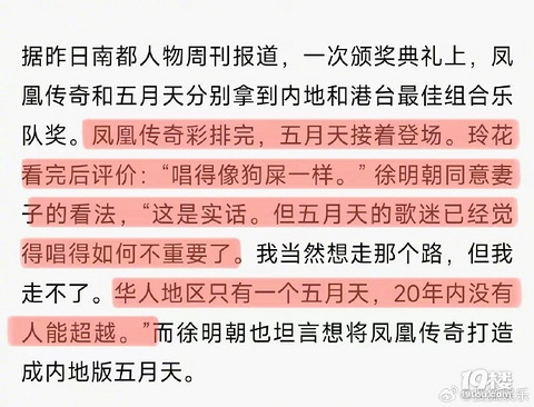 网友翻出了2014年凤凰传奇玲花评价五月天唱功的争议新闻:当时新闻写到,玲花在一场颁奖礼上听完五月天彩排后,评价五月天“唱得像狗屎一样”,丈夫徐明朝同意玲花看法,并说“五迷已经觉得唱的如何不重要了,只有一个五月天,20年内无人能超越”。后来玲花发长文解释,她说丈夫也是五月天歌迷,她在接受采访时没有聊过五月天,丈夫说玲花很早前确实说过五月天唱功不好,但没说“狗屎”,是自己帮玲花做了总结。