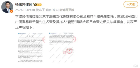 今日(9月16日),易烊千玺方@杨曙光律师发布律师声明:本律师依法接受北京羊踯躅文化传媒有限公司及易烊千玺先生委托,就部分网络用户侵害易烊千玺先生名誉及委托人“礐嶨”(què xué)演唱会项目声誉之相关法律事宜,发表严正声明。 随后,易烊千玺工作室转发律师微博:恶意诋毁艺人名誉,伤害作品,扭曲心意,触及底线。忍让已尽,从此以后交由法律裁决。 律师声明指出,委托人发现,自委托人演唱会项目开展以来,