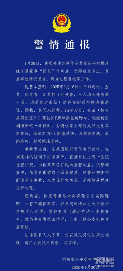 今天,绍兴市公安局柯桥区分局发布情况通报:1月29日,我局关注到网传金某在绍兴柯桥涉嫌交通肇事“顶包”信息后,立即成立专班,开展事故情况复查、调查过程复核等工作。现基本查明,2025年3月16日中午11时许,金某、徐某青、刘某祎(经核查,三人均为外省籍人员,均系首次来绍)结伴在绍兴柯桥古镇游玩、购物,其间未就餐。15时07分,金某(持有效驾驶证件)驾驶沪F牌照黑色越野车,途经柯桥湖塘街道一路段时,