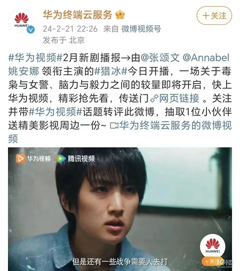 2月21日,网剧《猎冰》正式上线。 这是张颂文在《狂飙》大火之后的首部电视剧作品。同时,该剧的女主角系华为创始人任正非之女,被网友戏称为“华为二公主”的姚安娜。 《猎冰》主要讲述的是高智商毒贩和热血女警察,警匪搏斗的故事。一个是《狂飙》“高启强”,一个是逐梦娱乐圈的华为二公主,两人分别出演毒枭和女警,上演黑白较量。 在《猎冰》开播之日,华为官方账号也是大力宣传。 开播当日晚间,话题#姚安娜演技#于