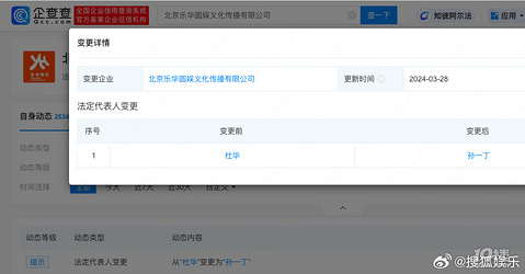 企查查APP显示,近日,北京乐华圆娱文化传播有限公司发生工商变更,法定代表人由杜华变更为孙一丁。此前,杜华已卸任名下多家公司法定代表人职务,包括天津乐华音乐文化传播有限公司等。 来源:搜狐娱乐