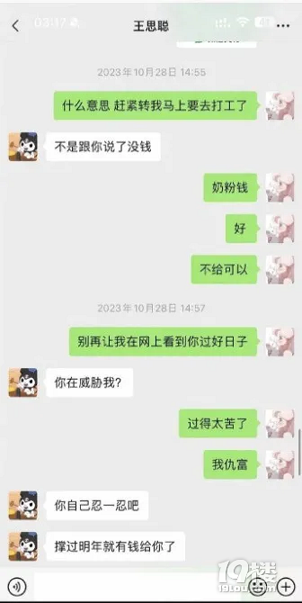 黄一鸣晒问王思聪要奶粉钱的聊天记录,“闪闪她爸不是不负责任,只是太困难了,他很爱闪闪,我的闪闪不是私生子,是被他爸爸认可的存在。” 来源:重头戏