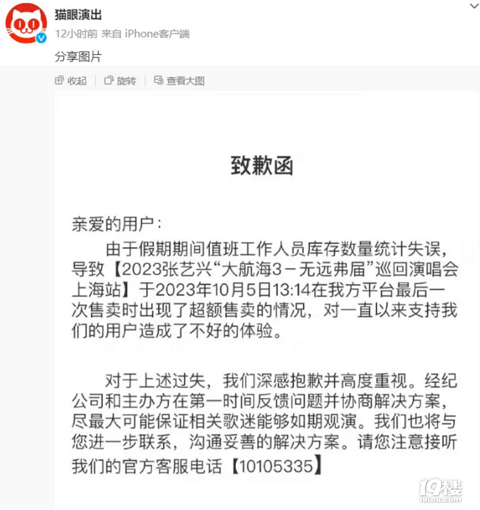 10月6日,猫眼演出官方发布致歉函称:由于假期期间值班人员库存数量统计失误,导致【2023张艺兴“大航海3-无远弗届”巡回演唱会上海站】于2023年10月5日13:14在平台最后一次售卖时出现了超额售卖的情况。经纪公司和主办方会尽最大可能保证相关歌迷能够如期观演。 此前,部分网友反映购买的张艺兴10月7日上海站演唱会被猫眼强制退票,引发热议。 来源:凤凰网娱乐