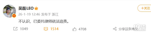 1月19日午间,吴磊发文回应#白珊珊 吴磊你欠我的拿什么还#,“不认识,已委托律师依法追责。” 随后@吴磊工作室 于评论区留言: 吴磊先生与该博主素不相识,无任何交集!也感谢所有关心及为吴磊先生发声的朋友,对于此类卑劣行径,我方会积极应对,必将依法维权到底!我们相信时间会证明真心,但也会手持利刃,让真诚有力可言! 据报道,1月18日晚,微博用户“白珊珊a”连续发布争议内容:先以模糊表述“他的床照1
