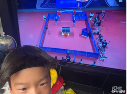 谢楠两个儿子追看亚运乒乓球男单,戴发带画画为运动员应援