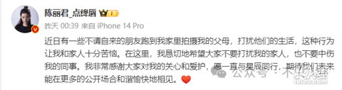 任谁都没有想到,私生这股风居然都吹到了越剧团...... 就在昨天凌晨,浙江小百花越剧团越剧演员陈丽君发文表示,有一些不请自来的朋友跑到她的家里拍摄她的父母,打扰老人家的生活,让全家人十分苦恼。 陈丽君还恳请这些人不要打扰家人,更不要中伤她的同事。 据不少网友提供信息,在某短视频平台,有不少YXH跑去陈丽君老家拍摄,蹭热度博取流量。 且不只一两个人那么简单,而是很多人都去陈丽君家,这些毫无边界感的