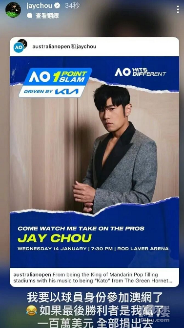 1月12日,据报道,@澳网AustralianOpen 正式官宣:著名网球爱好者周杰伦将参加澳网“一球制胜”挑战赛(1 point slam),这也是周杰伦国际网球赛事首秀。该赛事将于1月14日举行。 另据报道,周杰伦发文称自己将以球员身份参加澳网“一球制胜”挑战赛,他调侃自己可能连球都碰不到就会出局,并称只有一球,所以大家不用特地赶过来,自己如果赢了将会捐赠奖金。 “一球制胜”是澳网推出的全新表