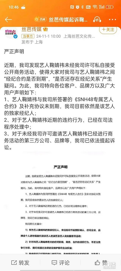 11月1日上午,丝芭传媒发布了严正声明:表示艺人鞠婧祎与其签订的《SNH48专属艺人合约》及补充协议尚未到期,公司仍然是鞠婧祎的独家经纪人。 声明中提到,鞠婧祎未经公司许可私自接受了公开商务活动,这种违约行为已经被提交到司法程序处理。同时,丝芭传媒还对那些未经允许邀请鞠婧祎参与商业活动的第三方公司和品牌提起了诉讼。 目前,此消息已冲上微博热搜第一。 随后,鞠婧祎方也发布声明回应:鞠婧祎与丝芭的《S