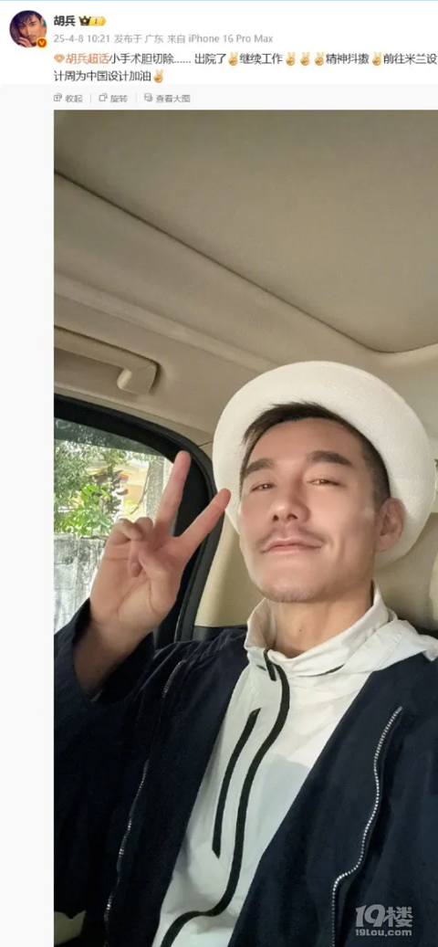 4月8日,男演员胡兵在其个人社交账号发文,透露目前做完胆切除手术已出院,继续开始工作,引发关注。 他晒出出院照发文:“小手术胆切除……出院了,继续工作,精神抖擞,前往米兰设计周为中国设计加油。”照片中,54岁的胡兵戴着白色帽子微笑比V,看上去状态恢复得不错。胡兵还在评论区感谢各位关心他的网友:“我会好好照顾好自己,谢谢大家。”还有网友询问手术具体情况,胡兵透露自己住院了一天,医生有交代术后注意事项