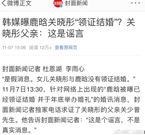韩媒曝鹿晗关晓彤领证结婚?关晓彤父亲在线辟谣