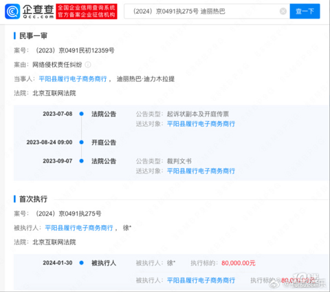 企查查APP显示,近日,平阳县履行电子商务商行与法定代表人徐某新增一则被执行人信息,执行标的8万元,涉及迪丽热巴与其网络侵权责任纠纷。 来源:搜狐娱乐