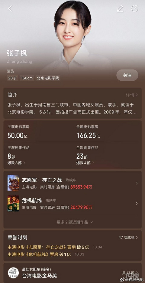 据猫眼专业版数据,张子枫主演电影《志愿军:存亡之战》《危机航线》正在热映,助张子枫主演电影累计票房破50亿! 来源:猫眼电影