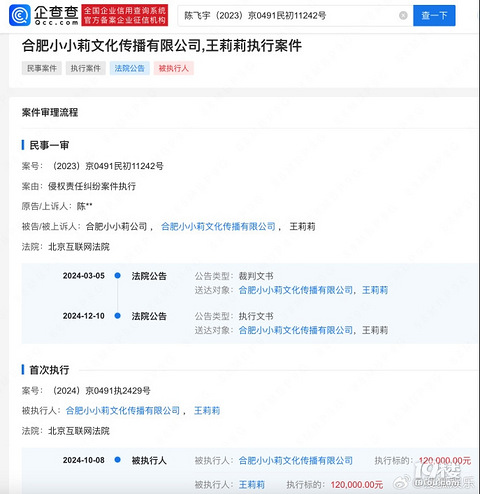 据企查查,因合肥小小莉文化传播有限公司等未履行致歉义务,法院公告陈飞宇与其判决书。公告显示,涉案三篇被诉文章系所谓的“吃瓜”营销类文章,其中多处言论,明显超出言论自由的范围,构成对原告的侮辱、诽谤,侵害了原告的名誉权。法院判决被告向陈飞宇发布致歉声明,并赔偿合计12万元。 来源:搜狐娱乐