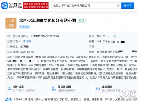 企查查APP显示,近日,北京少年攻略文化传媒有限公司发生工商变更,麦琳卸任法定代表人、股东、执行董事等职务,均由李行亮接任,退出前持股90%。该公司成立于2023年6月,注册资本50万元。据悉,该公司为李行亮为《再见爱人》第四季创作并演唱的片尾曲《山海有规则》的出品方。 来源:四川观察