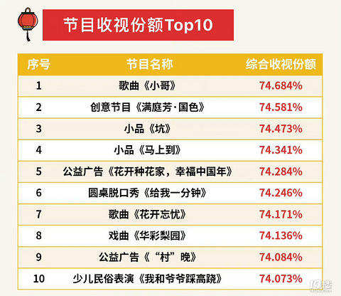 春晚收视率出来了!!! 分别列举了节目收视率TOP10和节目收视份额TOP10!!! 第一分别是圆桌脱口秀(赵晓卉、邱瑞、何广智、徐志胜)和《小哥》(黄渤)!!! ???你最喜欢春晚的哪个节目?