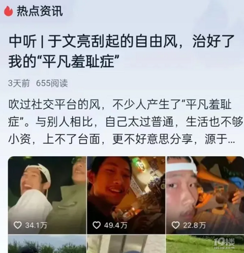 这个国庆有人突然火了。 10天涨粉100万。 这泼天的富贵到底给了哪个内娱明星。 一看。 让人摸不着头脑—— 没有段子、没有噱头,甚至没有内容。 就是呲着大白牙,吼上两嗓子,配上一段音乐转场。 就获得了425多万点赞量,27万多留言,20万收藏量。 这个叫于文亮的小伙,以不修边幅的打扮,怼脸的死亡角度,晒着自己的日常。 火了。 而他的评论区下面,网友po出很喜欢但不敢发朋友圈的照片、嘚瑟普通生活中