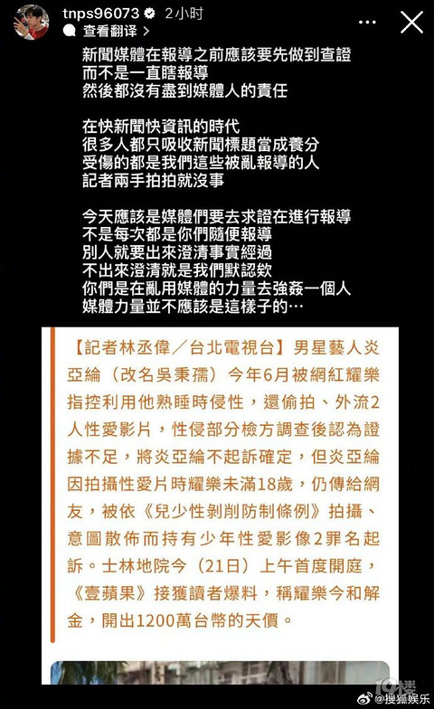 今年11月,炎亚纶因涉嫌偷拍私密影片、及外流散布视频被提起公诉。案件今日首度开庭,炎亚纶出庭受审,而邱耀乐则以被害人身份现身。 庭审结束后两人分别接受了采访。炎亚纶称会尽最大的诚意和努力,希望可以达成和解。当下媒体问炎亚纶(和解金)有一个数字吗?炎亚纶回复“不能说”,但随后有媒体爆料称邱耀乐开出了1200万(新台币)的价码。邱耀乐随后在社媒上发文回应相关传言,称应该是媒体去求证报道,而不是随便报道