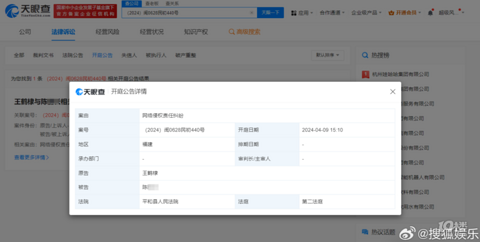 天眼查显示,王鹤棣与陈某某相关网络侵权责任纠纷案件新增开庭公告,原告为王鹤棣,案件将于4月9日开庭审理。 来源:搜狐娱乐