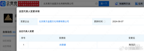 企查查APP显示,近日,北京黑方金圆文化传媒有限公司发生工商变更,尚雯婕卸任法定代表人职务,由陶福明接任,目前其仍持有该公司42%左右股份,并担任董事长、经理职务。 来源:搜狐娱乐