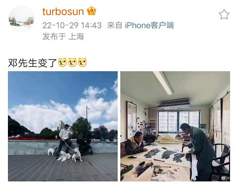 10月29日,孙俪在社交媒体平台发文,称“邓先生变了”,并晒出两张邓超遛狗、学习书画的照片。此前,孙俪也曾多次晒出自己修身养性的日常照。网友评论“邓超逐渐孙俪化”。 据悉,邓超、孙俪因戏生情,2010年5月8日,邓超生日之际,两人一起前往民政局领取了结婚证。结婚12年,育有一子一女,一家四口幸福甜蜜。 来源:凤凰网娱乐