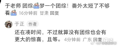 有粉丝问于正有没有团综,番外太短不够看。于正表示还在凑时间,就算没有团综也会有更大的惊喜。 来源:冲浪吧星同事