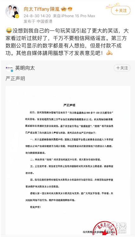 向太否认“直播卖出900多个159万元爱马仕”!公司声明:无中生有