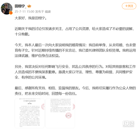 7月11日,演员田栩宁发文回应近期争议,否认相关传闻。话题#田栩宁回应#随即登上微博热搜第一。 田栩宁称:“我目前单身,从未结婚,也未曾育有子女。”他表示将通过法律维权,并向受影响的人致歉,称会履行公众人物责任,把未来交给时间,回馈信任。 其律师声明称,已固定部分捏造“已婚已育”“孕期出轨”等不实信息的证据,拟提起诉讼。 田栩宁称:“我目前单身,从未结婚,也未曾育有子女。”他表示将通过法律维权,并