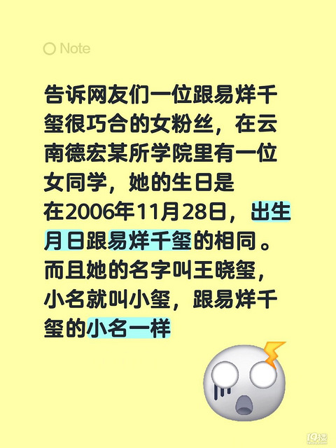 告诉网友们一位跟易烊千玺很巧合的女粉丝,在云南德宏某所学院里有一位女同学,她的生日是在2006年11月28日,出生月日跟易烊千玺的相同。而且她的名字叫王晓玺,小名就叫小玺,跟易烊千玺的小名一样。