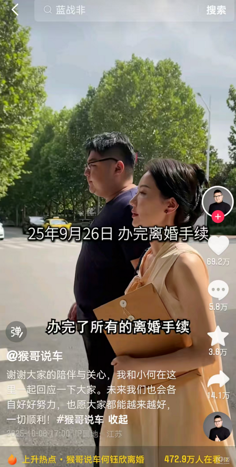 10月8日,千万粉丝网红“猴哥说车”发布视频称,自己与何钰欣已在9月26日办理离婚手续, “缘分尽了,和平离婚”“生活不是剧本,总会有一些意料之外的分歧”。 两人于2022年官宣结婚,曾被赞“网红神仙眷侣”。当年9月27日,“猴哥说车”和何钰欣举办婚礼。之后,双方传出“婚变”传闻。 2024年10月,“猴哥说车”在接受主持人张越采访时,透露了自己线下二期车库破产的状况。 10月底,“猴哥说车”再次