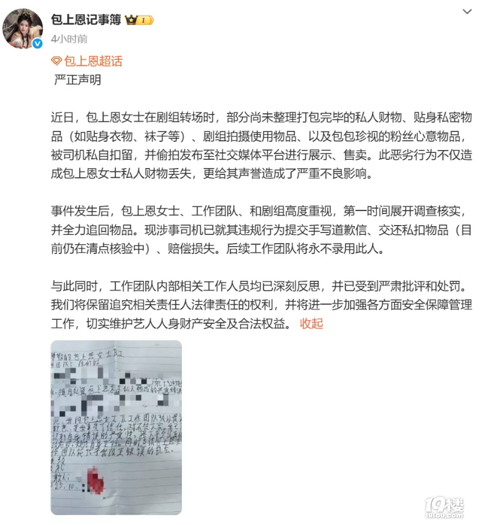 10月31日,女演员包上恩工作室发布严正声明,透露近日包上恩在剧组转场时,部分尚未整理打包完毕的私人财物、贴身私密物品(如贴身衣物、袜子等)、剧组拍摄使用物品、以及珍视的粉丝心意物品,“被司机私自扣留,并偷拍发布至社交媒体平台进行展示、售卖。” 事件发生后,包上恩女士、工作团队和剧组高度重视,第一时间展开调查核实,并全力追回物品。现涉事司机已就其违规行为提交手写道歉信、交还私扣物品(目前仍在清点核