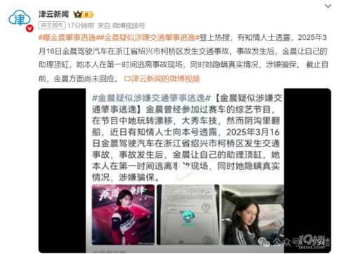 据消息,1月29日,“曝金晨肇事逃逸”登上热搜。 有知情人士透露,2025年3月16日金晨驾驶汽车在浙江省绍兴市柯桥区发生交通事故,事故发生后,金晨让自己的助理顶包,她本人在第一时间逃离事故现场,同时她隐瞒真实情况,涉嫌骗保。 截止目前,金晨方面尚未回应。 网友发文中提到,有知情人士称,徐长青是金晨的助理,事发时驾车的其实是金晨本人。交通事故发生后,金晨第一时间和她的经纪人迅速逃离现场,让助理留下