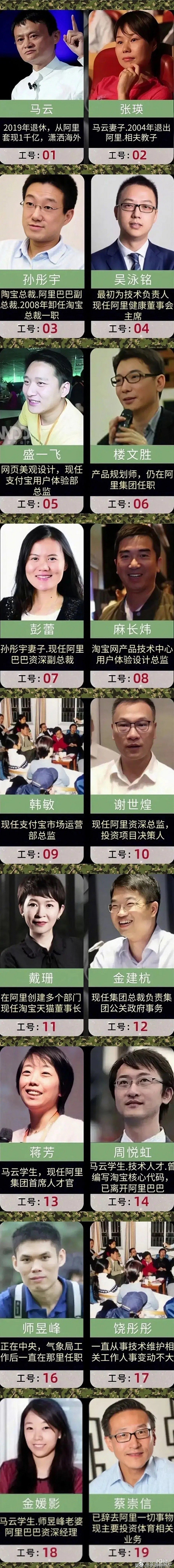 这是马云的17位合伙人,个个才华横溢,并且一起创建了强大的“阿里帝国”。值得一提的是孙彤宇,他在阿里的地位仅次于马云,被誉为“财神”。另外,孙彤宇还是淘 宝的创始人,有“淘 宝之父”的美称。孙彤宇于2008年离开阿里,而后在投资拼某多的项目中获得巨大的成功,不愧是厉害人物!