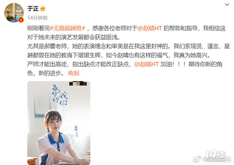 近日,《无线超越班》上郝蕾怒批赵晴的表现。于正刚刚发文回应此事:“感谢各位老师对于赵晴的帮助和指导,我相信这对于她未来的演艺发展都会获益匪浅。尤其是郝蕾老师,她的表演理念和审美是在我这里封神的。我们家瑞贤、谨言、星越都曾在她的教诲下熠熠生辉,如今赵晴也有这样的福气,我真为她高兴。严师才能出高徒,指出缺点才能改正缺点。 ” 来源:搜狐娱乐