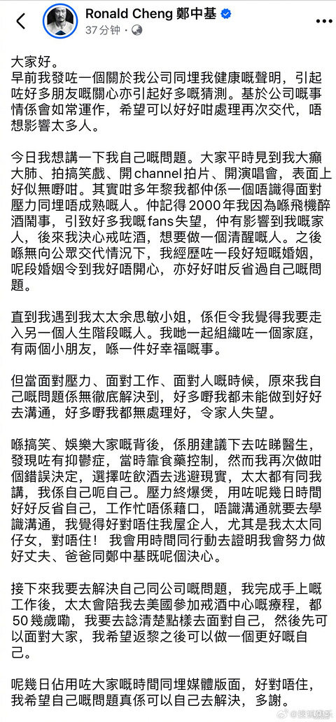 郑中基早前宣布因个人情绪及健康问题,高雄演唱会后退圈,今日他再发长文解释退圈原因:1.自己表面开朗,实则抗压能力不足,年轻时就曾醉酒闹事。2.曾经与阿sa的短暂婚姻也影响到了自己情绪。3.看医生后发现自己有抑郁症,但没有好好吃药,反而通过喝酒去逃避现实。4.退圈后太太余思敏会陪自己去美国戒酒中心治疗。 来源:搜狐娱乐