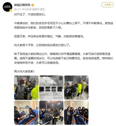知名摇滚乐队丝绒公路乐队吉他手毛毛(周若尘)意外摔下舞台。 11月19日晚,@丝绒公路乐队 发文:当晚演出时,我们的吉他手毛毛不小心从舞台上摔下,不得不中断演出。紧急送到医院拍片诊断后,发现肋骨断了六根。 检查结果显示,毛毛没有出现骨折错位、气胸、内脏损伤等情况。 丝绒公路2025新专辑巡演 · 宁波站于11月19日晚8点开始,对于演出中断一事,@丝绒公路乐队 向大家致歉,表示将开通退票通道,