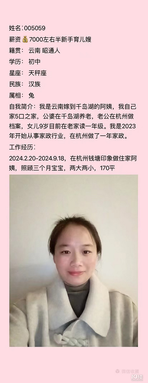 姓名:001658籍贯:安徽黄山年龄:49岁属相:虎学历:高中身高:160cm体重:55kg家庭情况:一家三口,爱人在老家做水电工,女儿在合肥读大一。工作经历:2018年-2019年,在西湖高尔夫别墅做了2年,主要保洁整理收纳,客户家有专门的做饭家阿姨,客户家一家四口,面积1000多平2020.2-2021.1在大华西溪风情,做住家家务,主要负责烧饭卫生家务,偶尔接一下孩子上下学,客户家一家四口,
