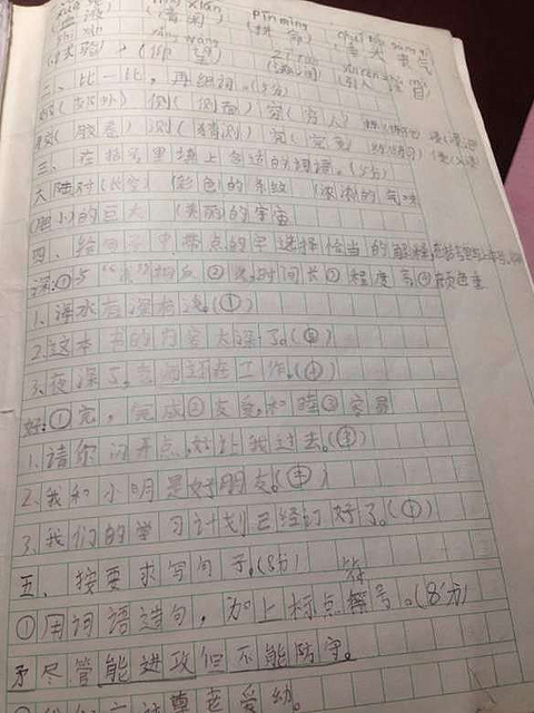 今天12月23日放学回到家给孩子烧了点心吃!吃好后没多久要去上17:00舞蹈课了,有一个半小时舞蹈课18点30分钟多点跳好回到家就18点50分了在吃晚饭!后就开始做作业了!今天作业语文复习试卷做一张!还有批改语文试卷后写错一两个字要抄整张试卷除了作文篇!老师也够狠的!虽然为了孩子学习上进不过这招也太夸张了!本来错的字写几遍情有可原!居然整张都要抄!后就开始做作业了!园地三抄写二遍!作文扣4分以上都