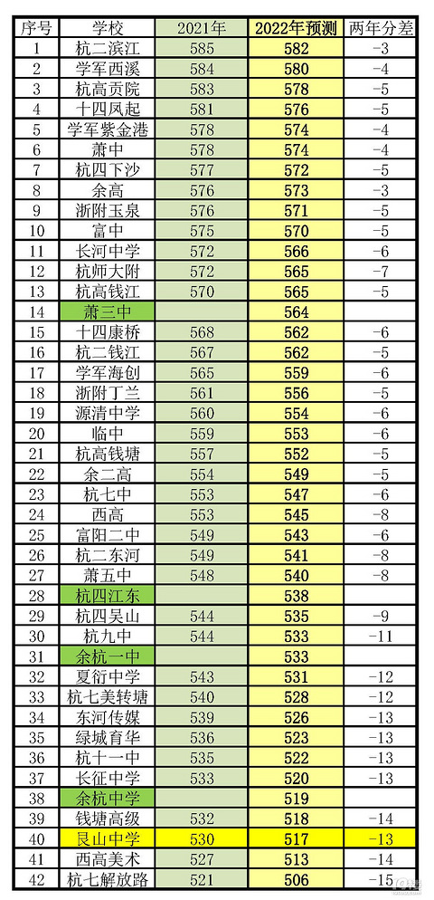2022杭州各高中录取分数线预测1、只是预测,准确度有待验证。2、对比今年和去年的各科的难易程度和分差3、小范围估分范本4、报考人数和录取人数比例变化5、各个招生高中宣传力度对家长和孩子报考的影响6、新增学校以及新增人数的分布等级区间不确定因素1、近千人的加分人员分布区间2、改卷的松紧度要求可以参考,不喜勿喷总体来说:1、位次变化不大,县中名次和分数会有所提高。2、高中学生资源在前一半的分配会比以