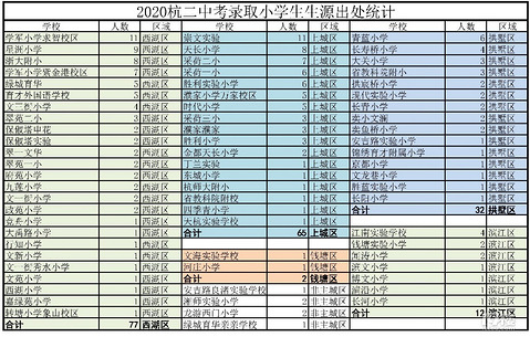 2020年杭州二中裸考小学生源出处的表格是通过对民间大神收集的数据的分类核对汇总以下。杭二2020年裸考招生人数为259,收集到的主城区人数188人。西湖区77人占比41%,上城区65人占比34.5%,拱墅区32人占比17%,滨江区12人占比6.4%,钱塘区2人。表格中这届杭二新生小学毕业的时候是可以跨区考比如文澜,育才等民办初中。2020年裸考考杭二中最低录取分是540分(不含体育分),满分是5