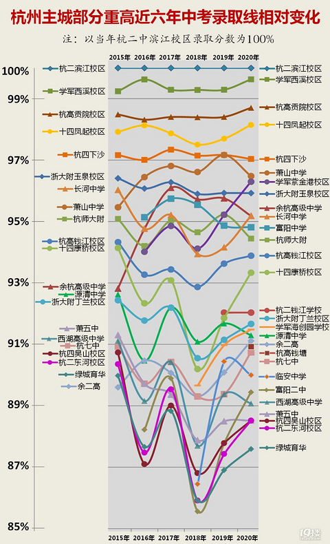 一图看清2015-2020杭州重高录取分数线相对变化(更新)