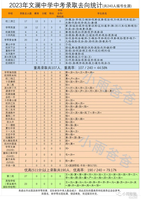 小雨爸爸出了文澜中考录取统计和观城武林。文澜以240个派位生源做基数的统计,观城武林基数78先看过去10年一直巅峰的民办一哥文澜中学吧,240人录取去向,重高的就有107人被录取,比例接近45%, 优高以上比例接近80%。从统计表看最后一栏也就是没有被一批、二批录取外,只有区区23人,不到10%,也就是说文澜普高率超过90%。 而且这23人也不全是职高,也肯定有去国际学校、去外地之类的。综合文澜摇