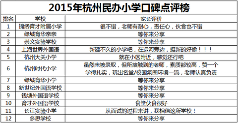 最近,关于幼升小的新闻不断, 版内不少学爸学妈前来咨询杭城各小学一些情况。比如“作业多不多”、“老师耐心吗?”、“学校伙食怎么样?”以及“学校活动多不多”等。之前我们做了一期“杭城公办小学”的排行榜。这期我们来做"杭城民办小学"的排行榜。欢迎家里小孩已经上学的家长来评分,让我们来评出我们自己的2015年杭州民办小学排行榜!我们需要您的建议!表格内容版版实时更新,我们一起来完善这张表格吧! · 【点