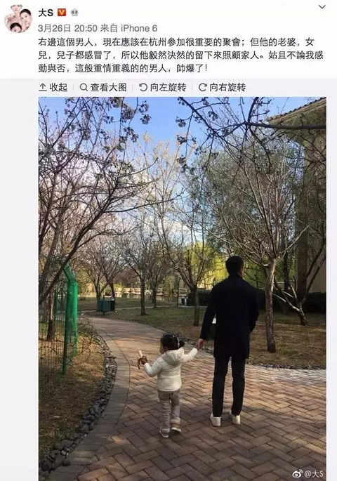 很多男人不懂,你是单位的螺丝钉,却是家里的顶梁柱。家庭能给你的美好,事业给不了。1大S微博说,有次她和孩子们都感冒了,老公汪小菲本来有个重要聚会,但他选择留下来照顾家人。“这般重情重义的男人,帅爆了!”大S力赞。下面有两条高赞评论:你的男人真的很好诶!我都想嫁!这有什么啊,小题大做。观点是相反的。但,他们都对。是不是小题大做?算是。老婆孩子生病,男人留在家里照顾,这是本分。那么这事能不能说明汪小菲