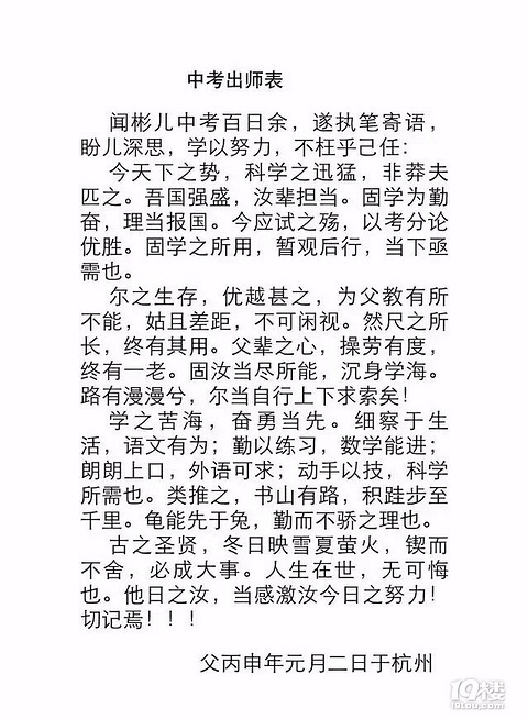 孩子初三那一年,老爸写了一篇《中考出师表》,今年孩子高三了,老爸又写了一篇《致儿鸿彬 成人礼说》,牛逼的老爸,我把这二篇原创拍照上图