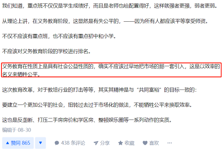 8月30日,教育部召开了新闻发布会,明确全面落实《关于进一步减轻义务教育阶段学生作业负担和校外培训负担的意见》有关部署要求,其中就提到了一点:严格执行均衡编班,不得以任何名义设置重点班。再一次,不得分设重点班和普通班,均衡分班的要求,被推到风口浪尖。知乎中关于该话题的帖子已成热门,目前为止已经有300多万的人浏览。浏览完之后发现,虽然不准分班的规定已经下达很多年,但确实有些地方一直都像网友们说的“