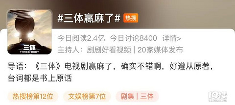 1月15日晚,电视剧《三体》在央视八套、腾讯视频等平台首播。开播后,迅速收获大量关注。 开播不久后,#三体赢麻了# #三体首播口碑# #一口气炫完了四集三体#等词条迅速冲上微博热搜榜,话题阅读量过亿。 在高关注度与浏览量之外,《三体》首播也收获了大批网友好评。许多中国网友认为,改编的故事在很大程度上忠实于原著。 由杨磊执导的《三体》电视剧历时四年打磨剧本,2020年开拍,历经126天拍摄。无论是中